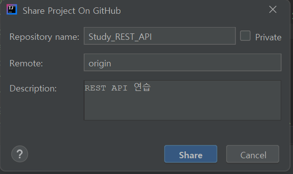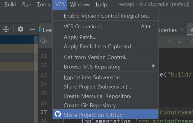 2. 상단 메뉴 VCS -> Share Project on GitHub 선택