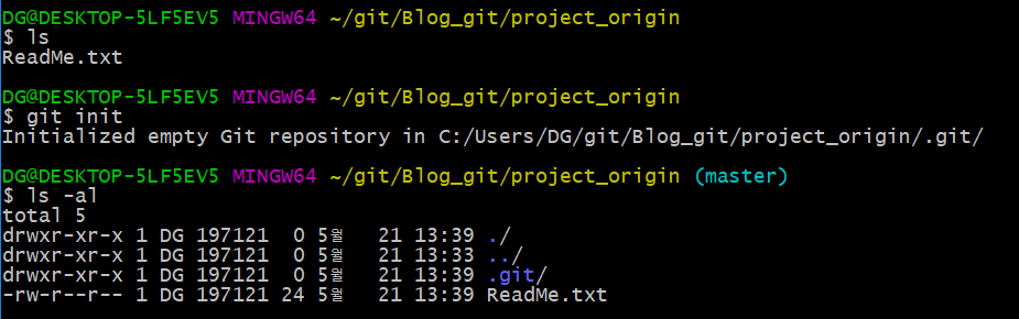 'git init' 은 .git 이라는 하위 폴더를 생성하여 해당 폴더를 git으로 관리할 수 있게 해주는 명령어 입니다.
