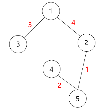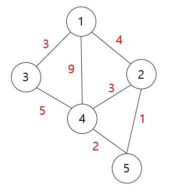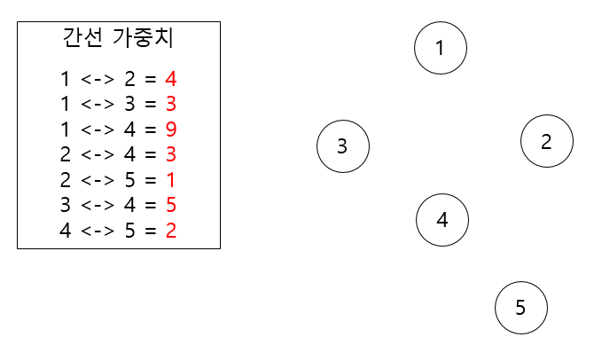 먼저 그림 1과 같이 5개의 노드가 있고, 연결 된 간선에는 가중치가 포함되어있을때,