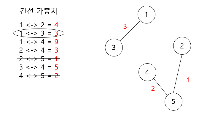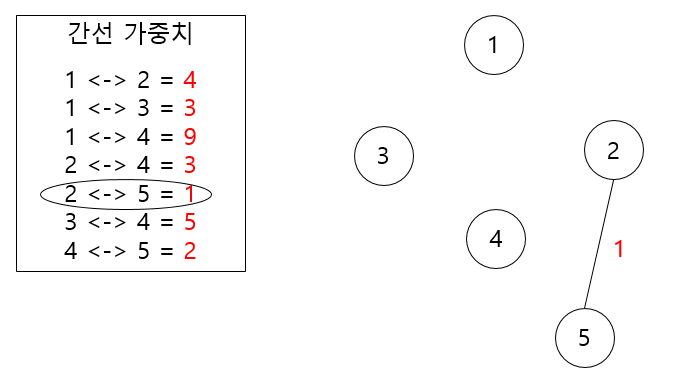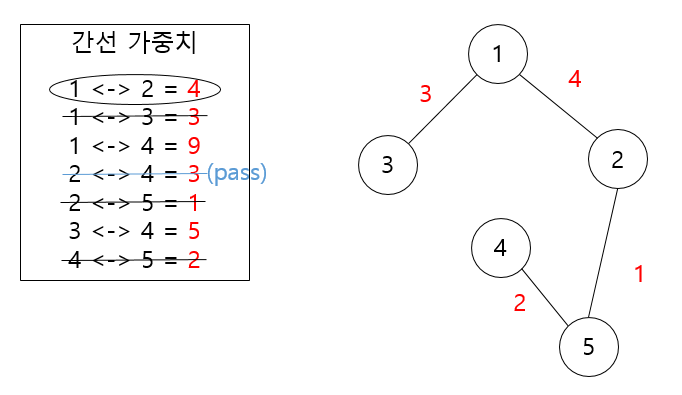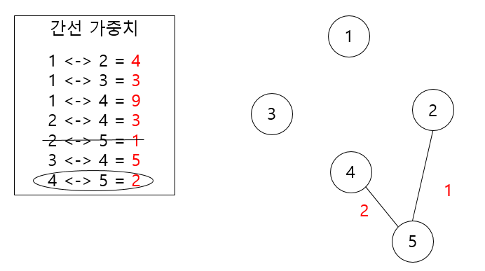 그런데! 2와 4를 연결하면 2 - 4 - 5 노드에 순환이 생기기 때문에 넘어가고 그 다음 작은 값 '1 <-> 2'를 선택 합니다.