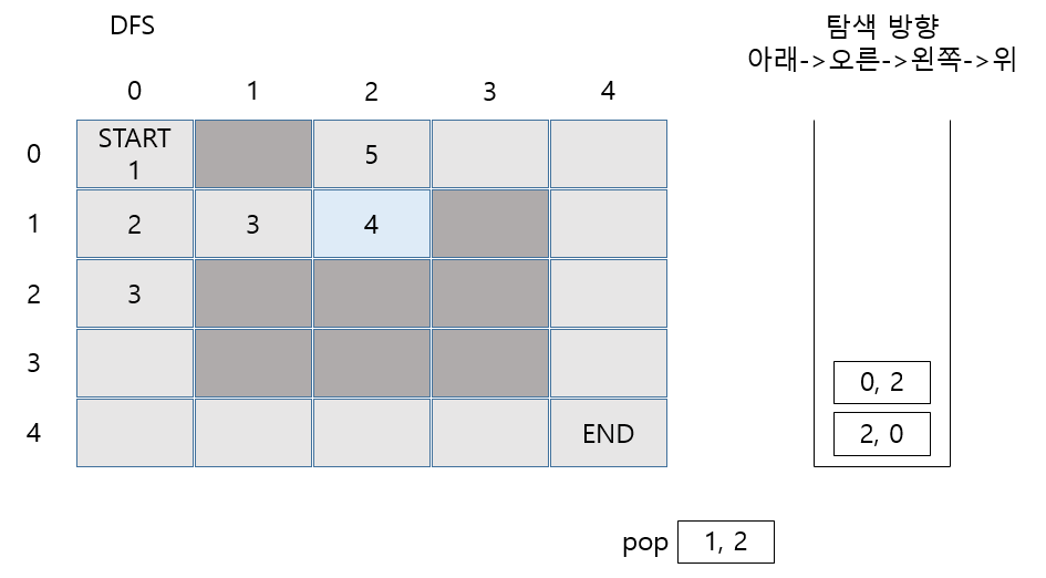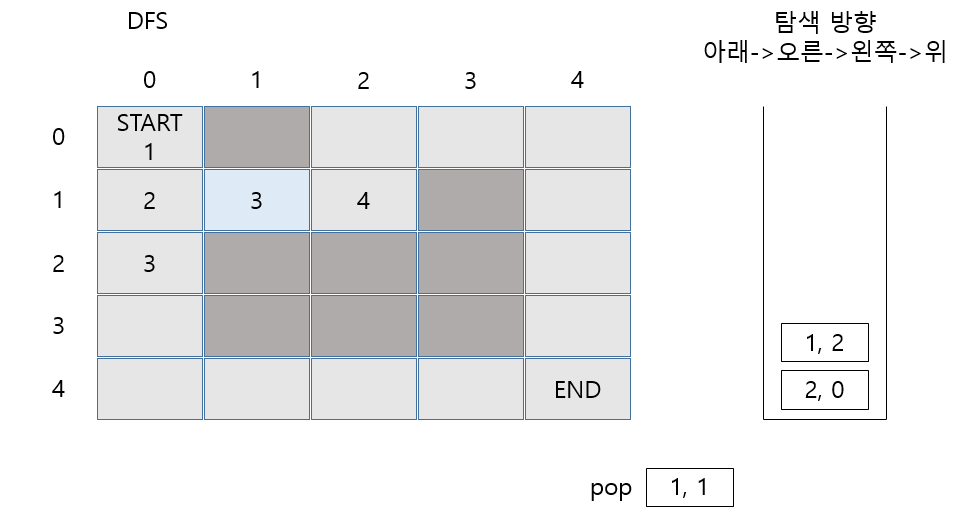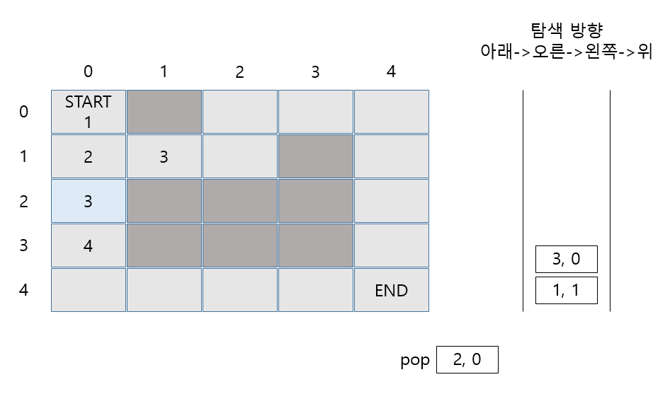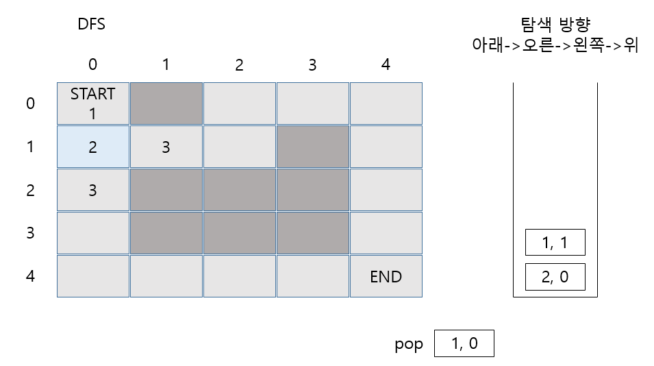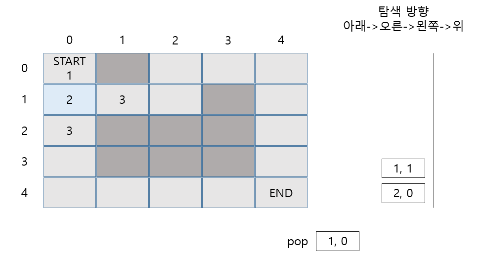 마찬가지로 (1,0)에서 갈 수 있는 2가지 길 모두 Stack에 Push 합니다.