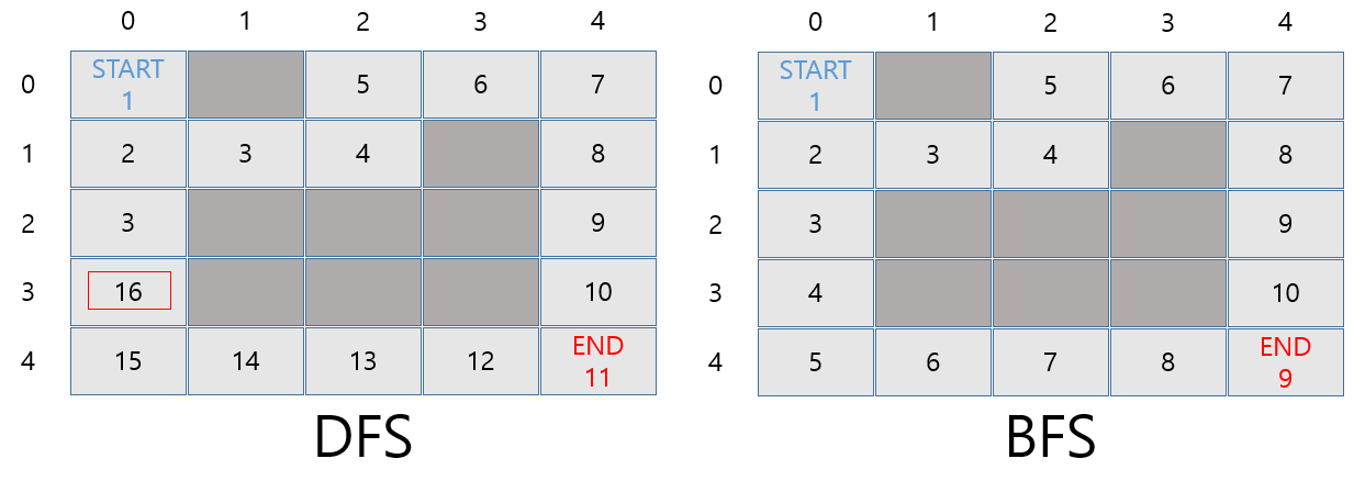 위 결과에서 보여주듯이 DFS 탐색은 한 방향을 쭉 탐색하기 최소 거리 구하기에는 적합하지 않습니다.