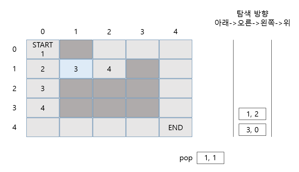위 그림과 같이 코드에 작성했던 순서대로 아래->오른쪽 탐색을 통해 (2,0)과 (1,1) 두개가 큐에 삽입 됩니다.