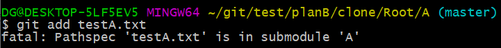 -> pathspec 'testA' is in submodule 'A'라는 에러 메세지 발생
