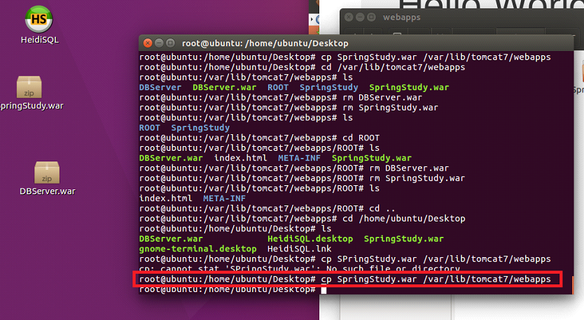 바탕화면에 있던 것을 tomcat 카탈리나홈 위치인 /var/lib/tomcat7/webapps에 복사함
